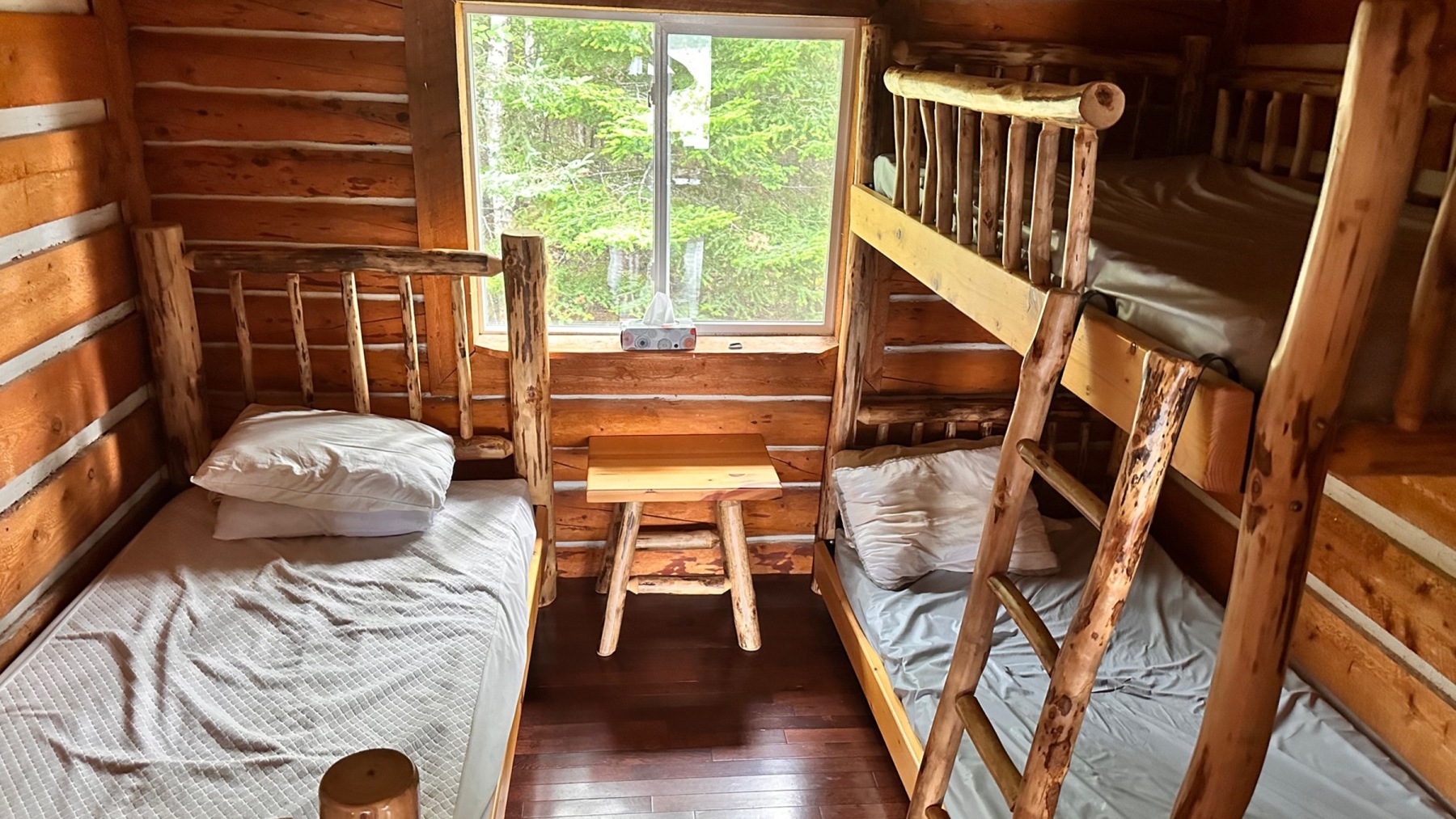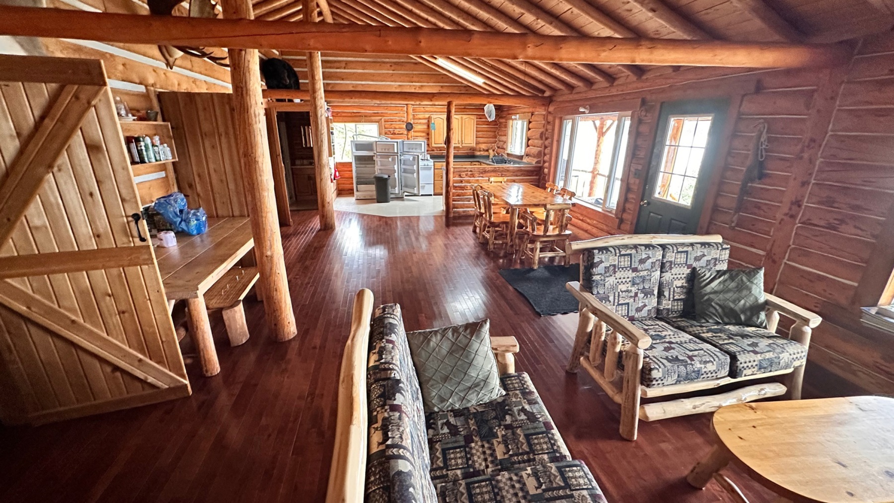 Constructed entirely with logs from the surrounding forest, this spacious 3-bedroom cabin sleeps 6-8.