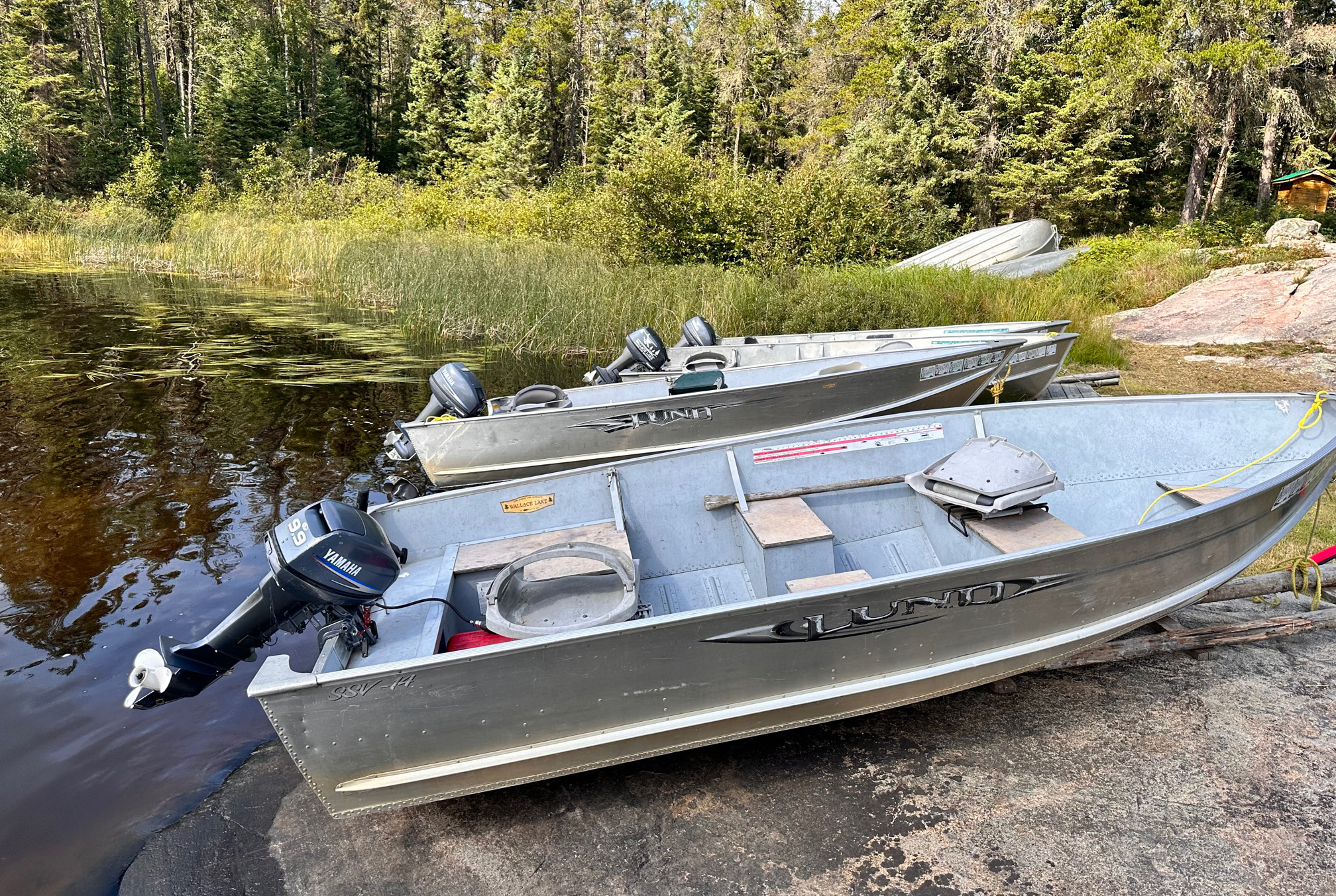 The Craven Lake cabin features hot and cold running water, a shower, solar-powered lighting, and propane appliances including a fridge, stove, and deep freeze. The boats are 14-foot Lunds equipped with 9.9 hp Yamaha motors.